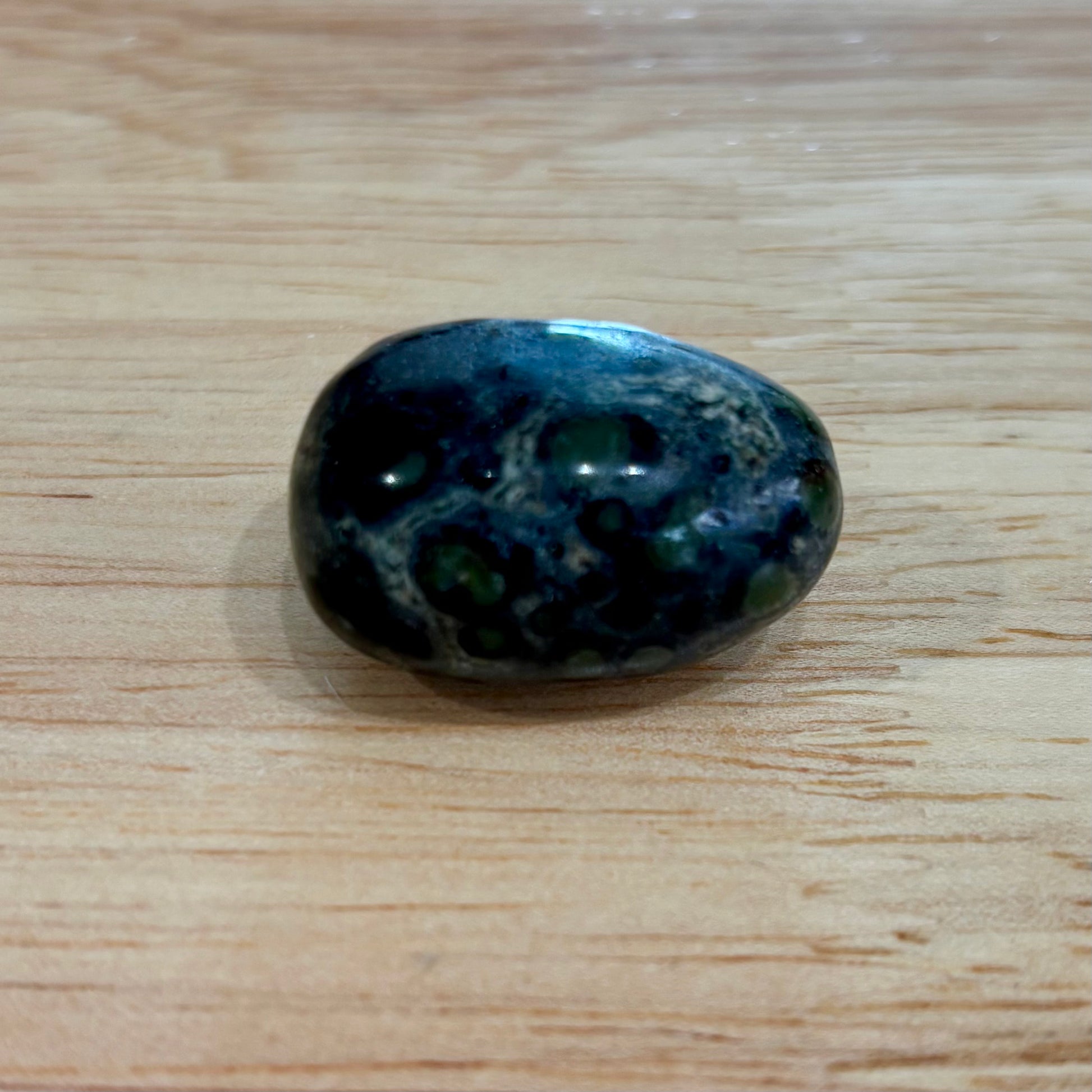 Our Kambaba Jasper tumblestones are truly ancient, with mesmerising dark green swirls and fossilised black orbs. This stone is a deep connection to the earth's wisdom, bringing a profound sense of peace and tranquility. It is a grounding stone that calms the mind and soothes troubled emotions. Hold it to feel its ancient, nurturing energy, which encourages patience, releases negative patterns, and connects you to the steady rhythm of nature.