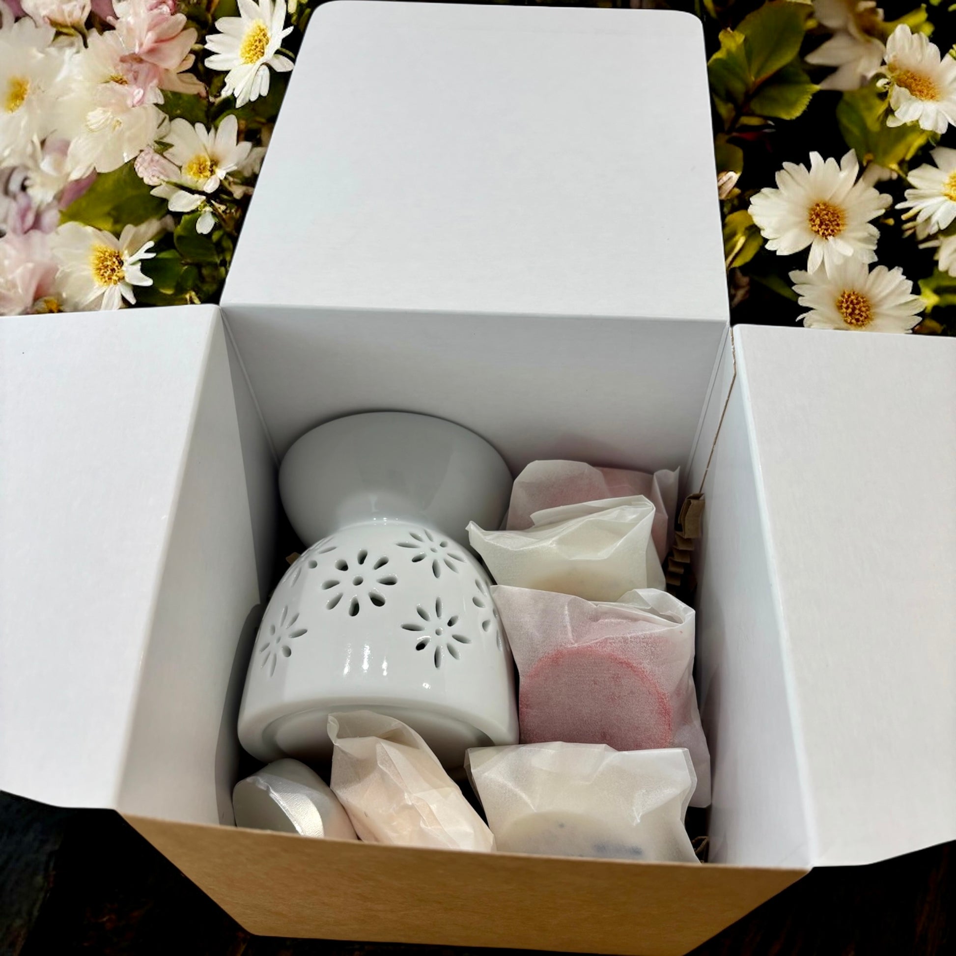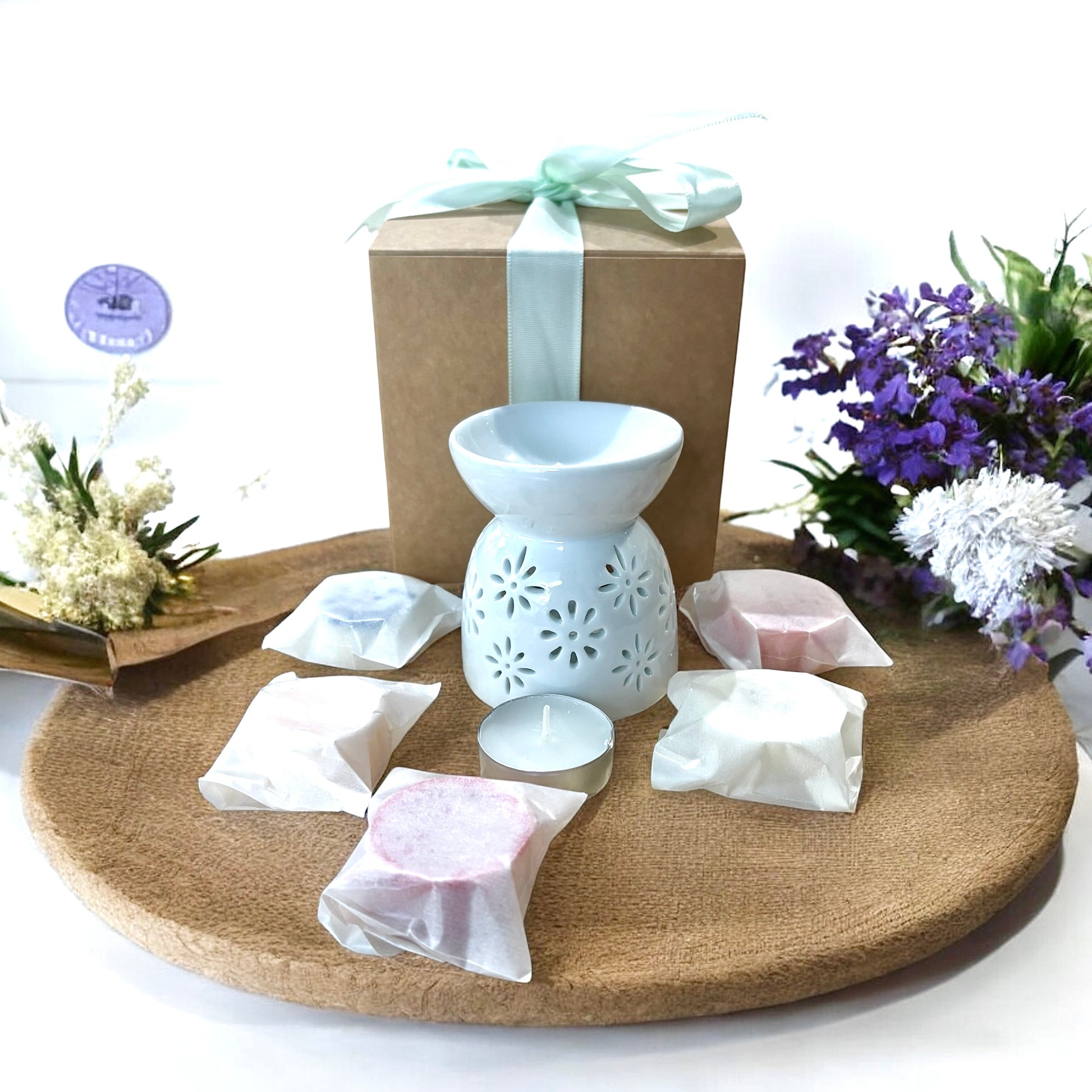 The Wax Melt Burner & 5 Wax Melts Gift Box is the perfect way to start your scent journey or surprise a loved one with a thoughtful, affordable treat. Each beautifully packaged box includes a stylish wax melt burner and five randomly chosen wax melts each one providing hours of calming, comforting fragrance for your home. Presented in a rustic kraft box with soft hay and a green ribbon, this set is ready to gift or enjoy, making it an ideal choice for birthdays, thank yous, or a little self-care.